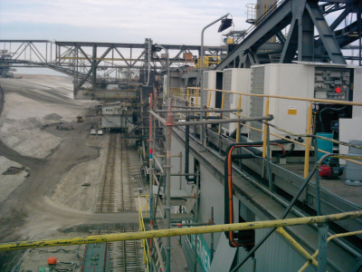 Potash mining. New sheave with integrated direct drive, air-cooled. Drive cooling integrated in the foundation and cooling system for power, control and measurement electronics integrated in the control unit. Developed in cooperation with customer and operator and installed under mining conditions.
